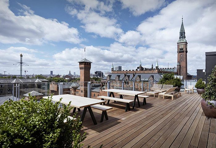 This cool boutique-style hotel is perfectly located between Radhuspladsen (City Hall Square) and the National Museum of Copenhagen. Several gay bars, including My Fair Ladies, Oscar, Scandinavian Leather Men (SLM), and Centralhjørnet are about a 3-minute walk from the hotel. Minimalist Scandi design can be found throughout the property. The rooms are bright, airy, and relaxing, in tones of soothing blue, grey, and white. The single rooms are ideal for solo travelers and the 6-person bunk bed rooms are a fantastic option for a group of friends. All rooms have an all-inclusive minibar, and there’s a complimentary wine hour every day. Breakfast is delicious and organic, and the rooftop bar has one of the best 360° views of the city.