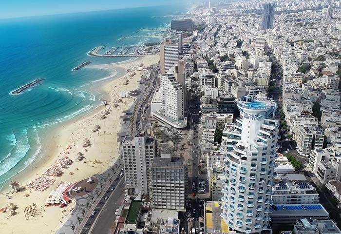 This hotel is set in a striking 30-storey tower just two minutes from the beach and promenade, giving many of its rooms top-notch views. These feature warm, minimalist decor, large bathrooms, and plush beds – make sure to get a balcony if you can. The suites are perfect for longer stays, usually including a kitchenette as well as living and work spaces. The building is topped with a freeform swimming pool offering panoramic Tel Aviv views, and there is also a well-equipped gym. The location is ideal, walking distance to world-class beaches, restaurants, gay bars, architecture, and shopping.