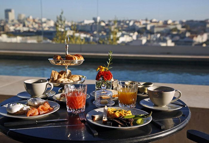 Café Príncipe Real serves breakfast in the mornings and then becomes a stylish restaurant for lunch and dinner, serving dishes built around Portugal’s influence on South American, African, and Asian cuisines. They also have an excellent cocktail menu and a terrace overlooking the outdoor pool, one of the hotel’s highlights with stunning views over Lisbon.