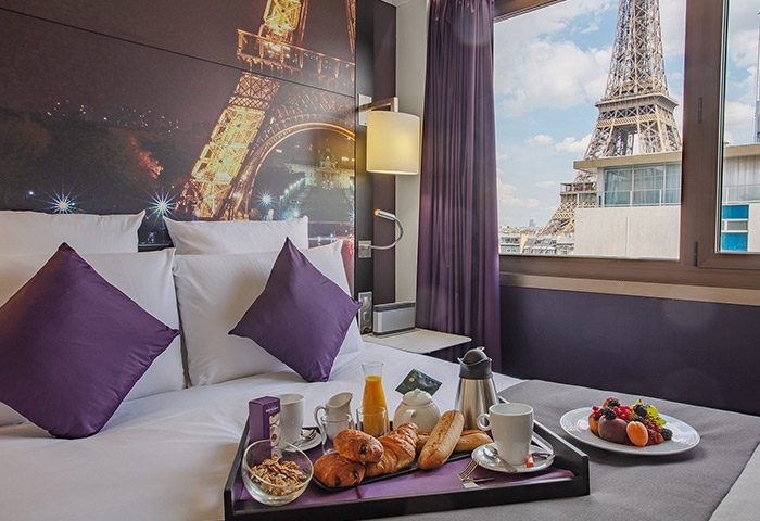 The hotel has been recently renovated and all the rooms are looking stylish and modern. The Eiffel Tower is a recurring theme in the rooms, with large murals of the monument overlooking every bed, but the decor is otherwise simple and minimalist. Most of the rooms look alike, but differ in size, amenities, and view – the Eiffel Tower view in certain rooms never gets old. Privilege rooms have additional luxury bedding, iPod docking, and Nespresso machines, while the suites have heavenly essential oils diffusers in the showers.