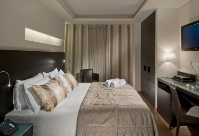 This elegant boutique hotel is conveniently located in the historic city center, between Monastiraki and Gazi, Athens’ two main gay hubs. It’s about a 10-minute walk to Rooster Cafe in Monastiraki and 15 minutes to the gay bars and clubs in Gazi, such as Moe, BIG, and Sodade 2. Rooms have cozy warm palettes and modern design. The suites are worth splashing out on, thanks to their spacious layouts and private terraces with Acropolis views: book the Grand Suite for a group of friends, or the Petite Suite for a romantic getaway. O&B takes pride in offering a personal service, and its staff are super helpful and welcoming.