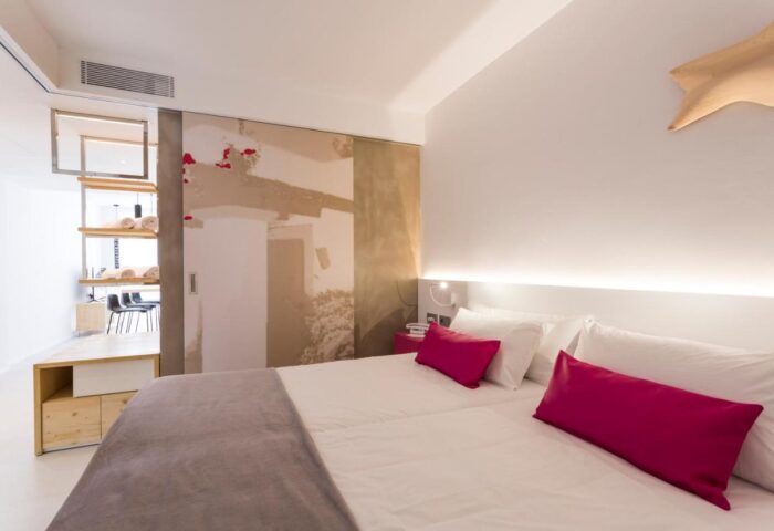 All of the suites at One Ibiza Suites are spacious and modern, featuring chic minimalist decor with fun pops of color. Suites can sleep up for four people, and you can choose between various perks like sea views, hot tub terrace, or direct pool access. The beds are exceptional, especially after a big night out on the town. The highlight of the hotel is its awesome rooftop terrace, complete with heated infinity pool, a swanky cocktail bar with DJ nights, and incredible views of the sea and Formentera island. There is also a well-equipped gym, a second seasonal outdoor swimming pool, and a Mediterranean restaurant. One Ibiza Suites is located directly on the v promenade, seconds from the beach.