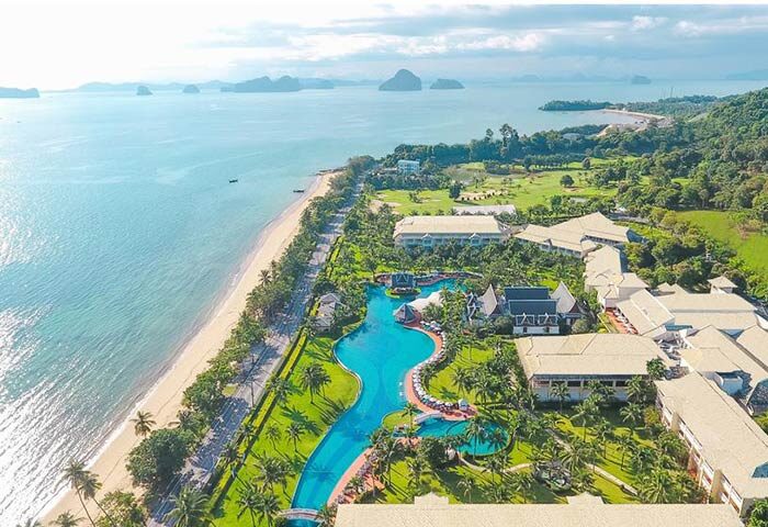 Sofitel Krabi Phokeethra Golf and Spa Resort stands out thanks to its elegant colonial style, which blends Victorian luxury elements like teak floors and romantic furniture with traditional Thai influences, such as temple-inspired roofs. The old-fashioned design gives you the impression of stepping back in time, which is perfect for travelers who want to get away from it all.